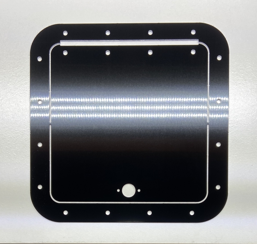 Description:8" long by 8" wide gloss black aluminum access door and frame. It comes with dzus springs and captivated dzus buttons as well as the hinge. This access door and frame come with a protective film for installation.