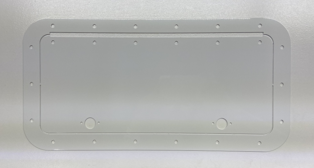 Description:14" long by 6" wide white aluminum access door and frame. It comes with dzus springs and captivated dzus buttons as well as the hinge. This access door and frame come with a protective film for installation.