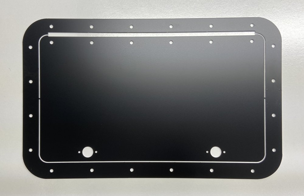 Description:14" long by 8" wide flat black aluminum access door and frame. It comes with dzus springs and captivated dzus buttons as well as the hinge. This access door and frame come with a protective film for installation.