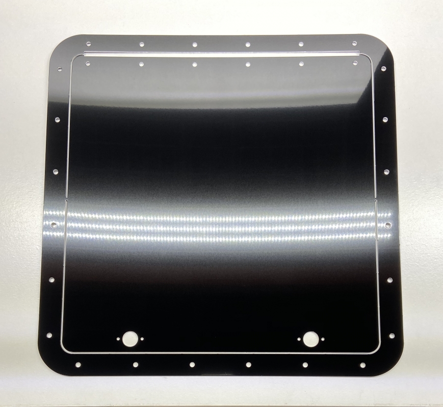 Description:14" long by 14" wide gloss black access door and frame. It comes with dzus springs and captivated dzus buttons as well as the hinge. This access door and frame come with a protective film for installation.