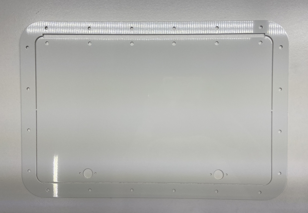 Description:16" long by 10" wide white aluminum access door and frame. It comes with dzus springs and captivated dzus buttons as well as the hinge. This access door and frame come with a protective film for installation.