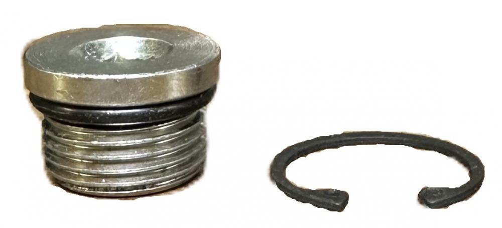 Description:Replacement 3/4"-16 flat bottom zinc plug with a 7/8" bore diameter black-phosphate steel internal retaining ring clip.