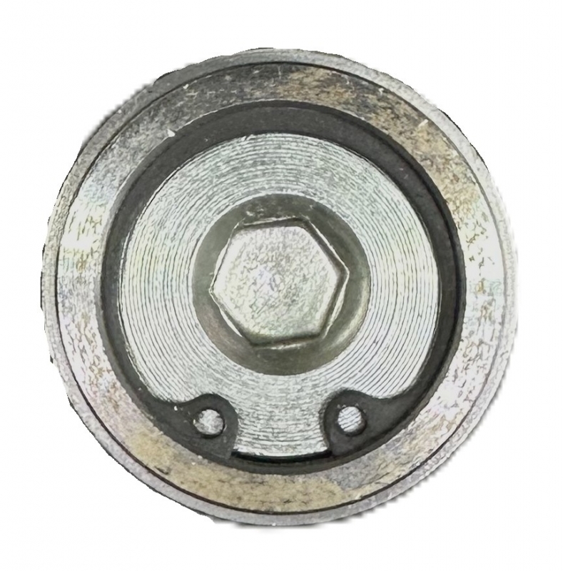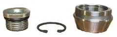 Description:Replacement 3/4"-16 flat bottom zinc plug with a 7/8" bore diameter black-phosphate steel internal retaining ring clip and a steel #8 o-ring port with snap ring groove bung.